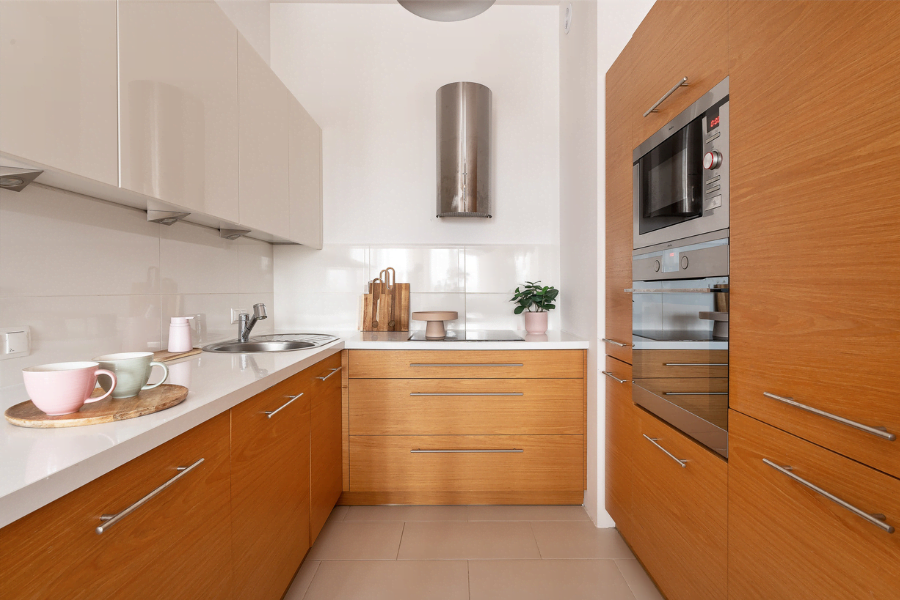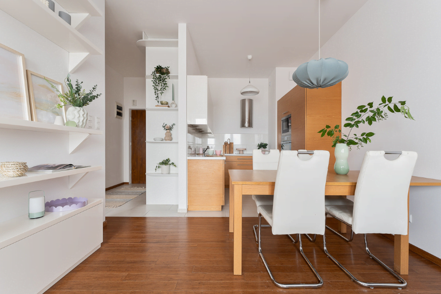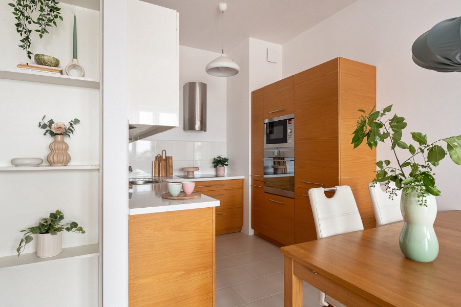 - Naturalne drewno i beże – przewijające się w meblach kuchennych, stole, stoliku kawowym i podłodze, które ocieplają przestrzeń i wprowadzają przytulność,