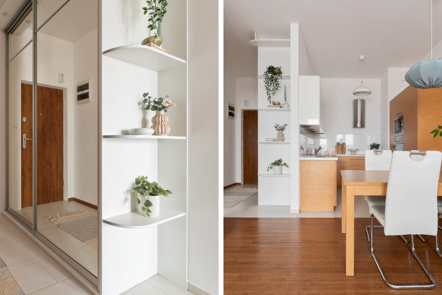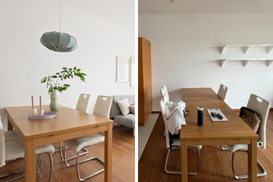 Wnętrze miało dobrą bazę: białe ściany, drewniane akcenty i dużo naturalnego światła. Postanowiłam ożywić tę przestrzeń pastelowymi dodatkami, miękkimi tekstyliami i subtelnymi dekoracjami, tworząc lekką, przyjazną atmosferę — miejsce, w którym od razu chce się zamieszkać.