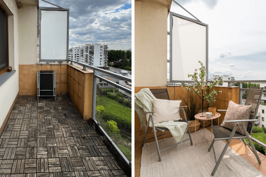- Uporządkowanie i aranżacja balkonu – dodanie dywanu, roślin i poduszek stworzyło przyjemną przestrzeń do relaksu