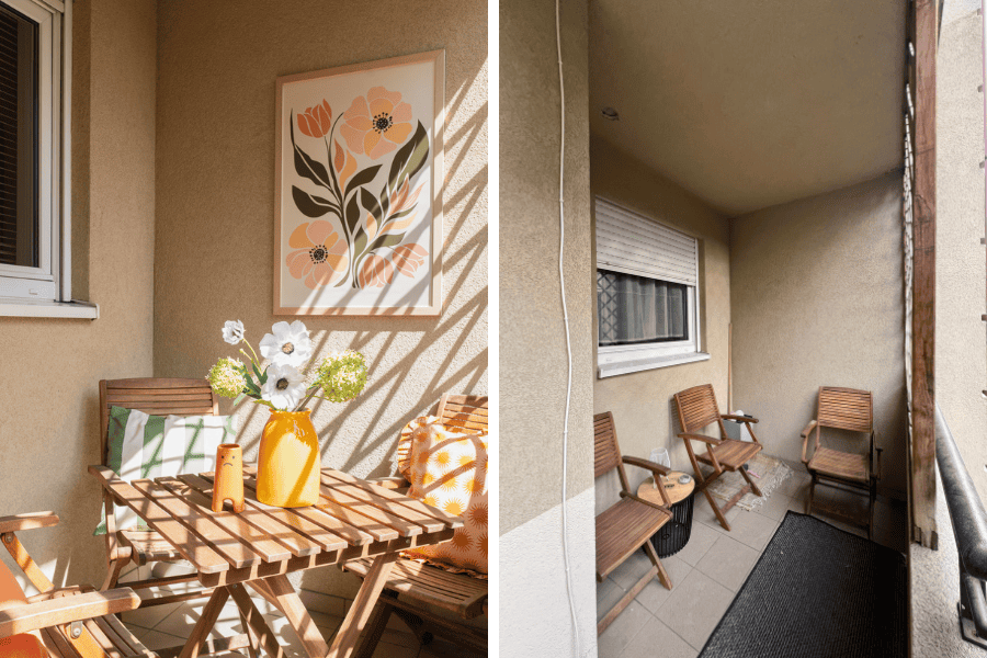 Stare krzesła zostały. Dodałam nowy stolik, miękkie poduszki i doniczki z roślinami. Kilka detali i balkon zamienił się w przyjemny kącik na poranną kawę. Czasem naprawdę wystarczy niewiele.