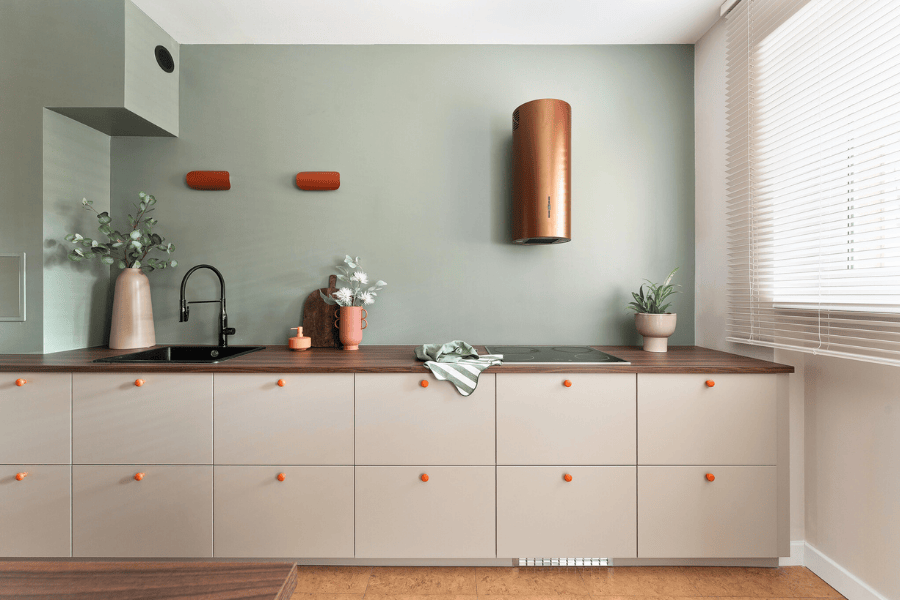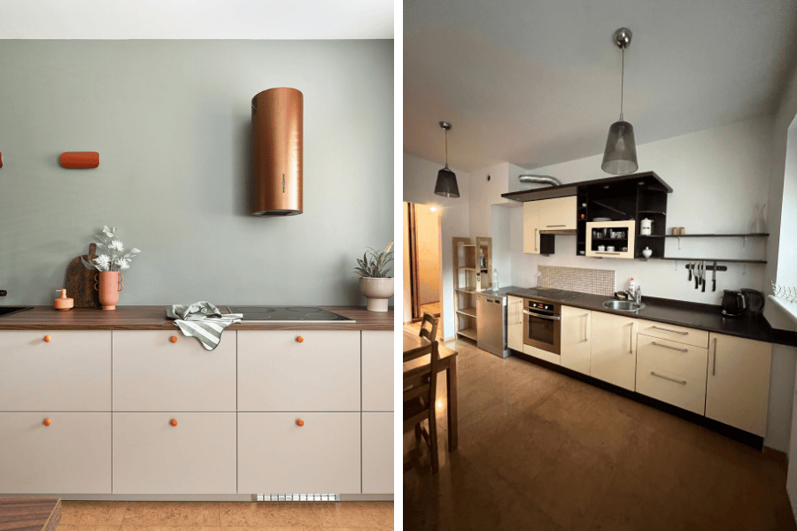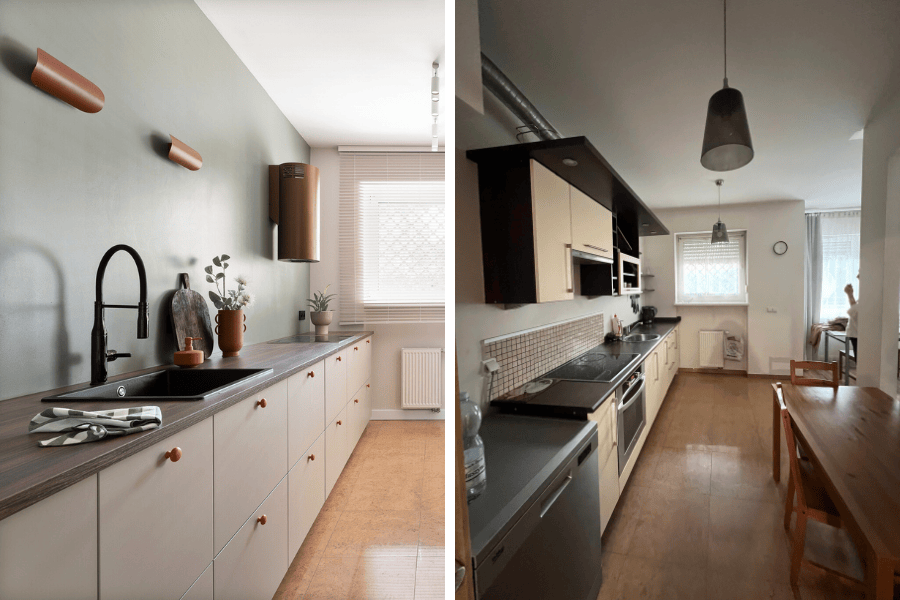 Kolorystyka zieleni i terakoty, wymiana części AGD i porządek w układzie sprawiły, że przestrzeń odetchnęła. Kuchnia przestała „dusić”, zaczęła zapraszać.