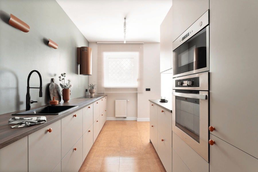 Kuchnie bywają przepełnione: za dużo szafek, za mało światła. Tutaj ratunkiem było wykorzystanie bocznej, dotąd pustej ściany – dzięki temu nad głównym blatem można było zrezygnować z górnych szafek.