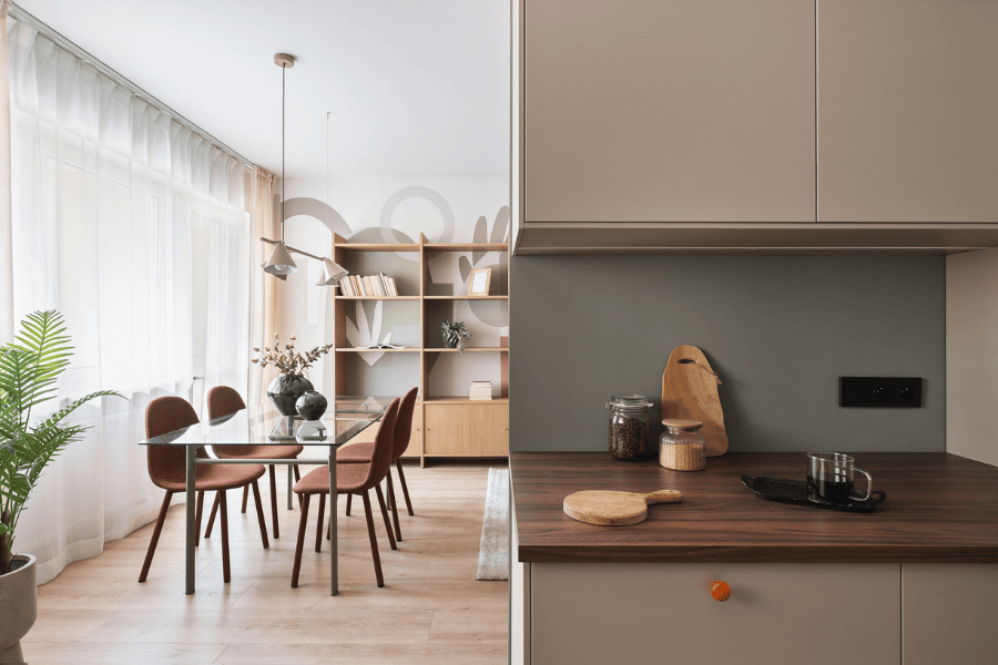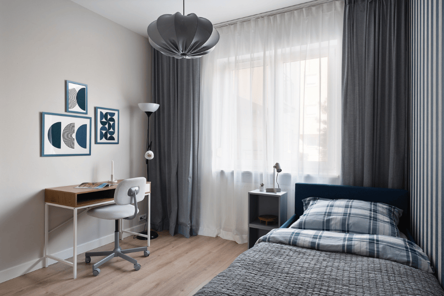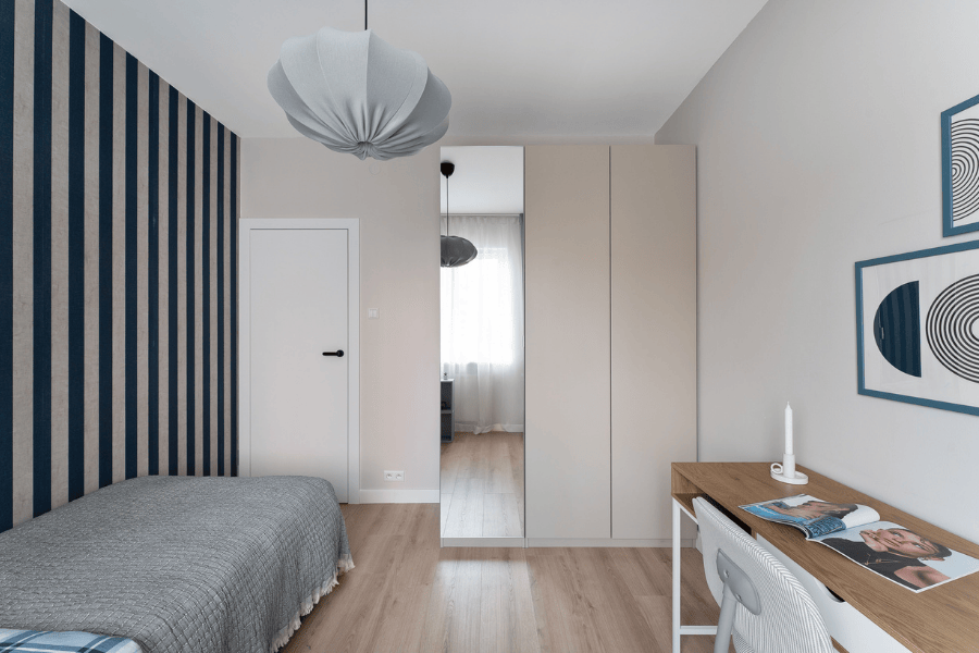 Neutralna paleta kolorów tworzy bazę, do której przyszli lokatorzy dołożą własny styl i dodatki. Tak zaprojektowany pokój zwiększa atrakcyjność mieszkania na rynku najmu – jest gotowy „na każdego”, a jednocześnie daleki od nudy.