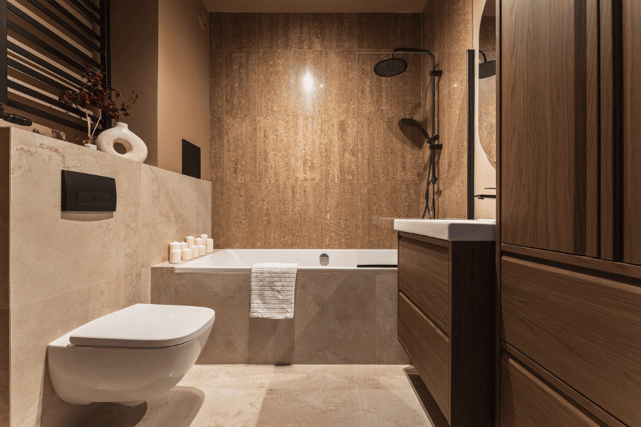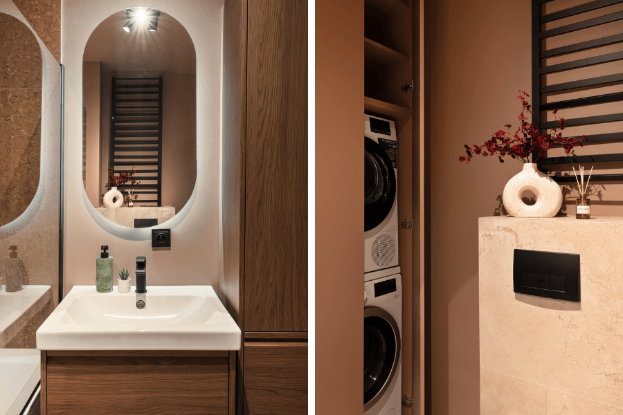 Wymieniliśmy stelaż i miskę, poprawiliśmy podłączenia. Część płytek udało się ocalić, resztę uzupełniliśmy. Przy okazji przenieśliśmy grzejnik i wymieniliśmy wannę. Do tego zabudowa: meble z IKEI w odcieniu orzecha oraz szafki na wymiar, w których zniknęły pralka i suszarka. Sufit i ściany pomalowane na czekoladowo dopełniły całości – łazienka zyskała głębię, stała się przytulna i – co najważniejsze – pachnie świeżością.