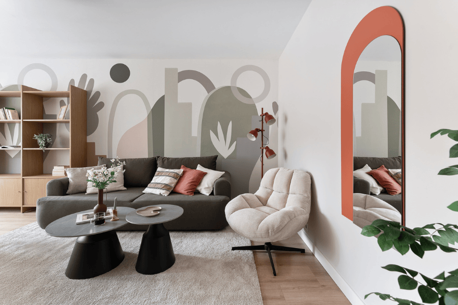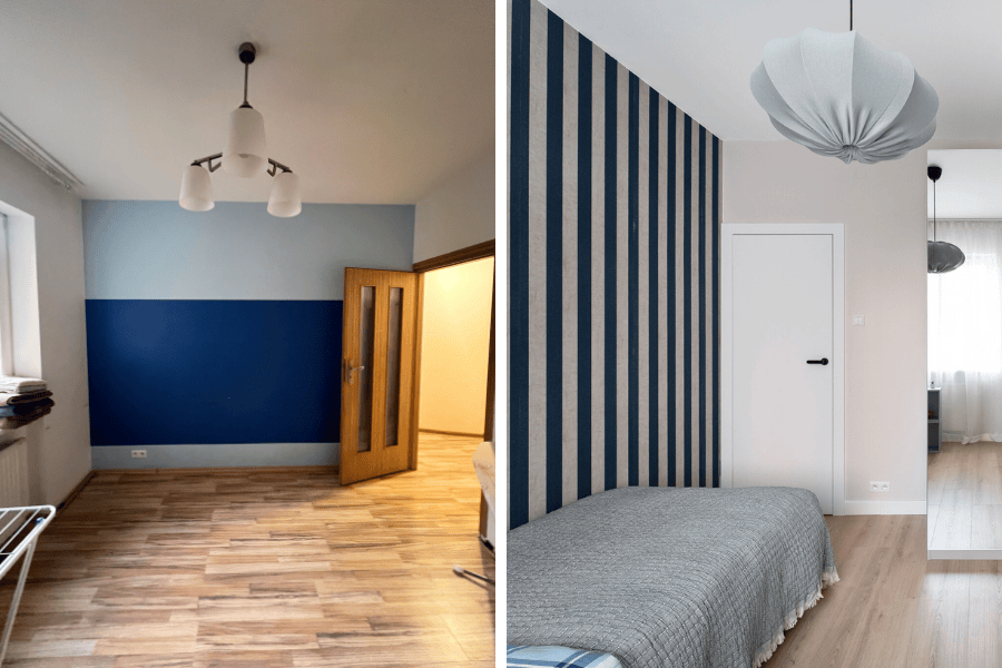 Na ścianie za kanapą „musiało coś się wydarzyć”. Wybór padł na graficzną, wyrazistą tapetę. To była decyzja z tych, które wymagają zaufania – ale efekt wynagrodził wszystko. Po wymianie paneli na spokojniejsze wizualnie, salon wreszcie stał się harmonijny, charakterystyczny i gotowy do życia.