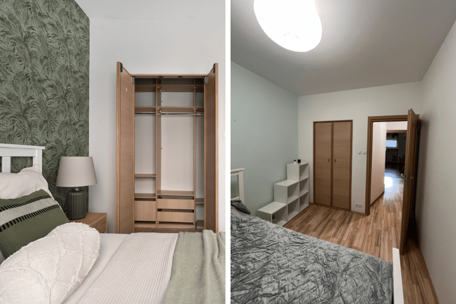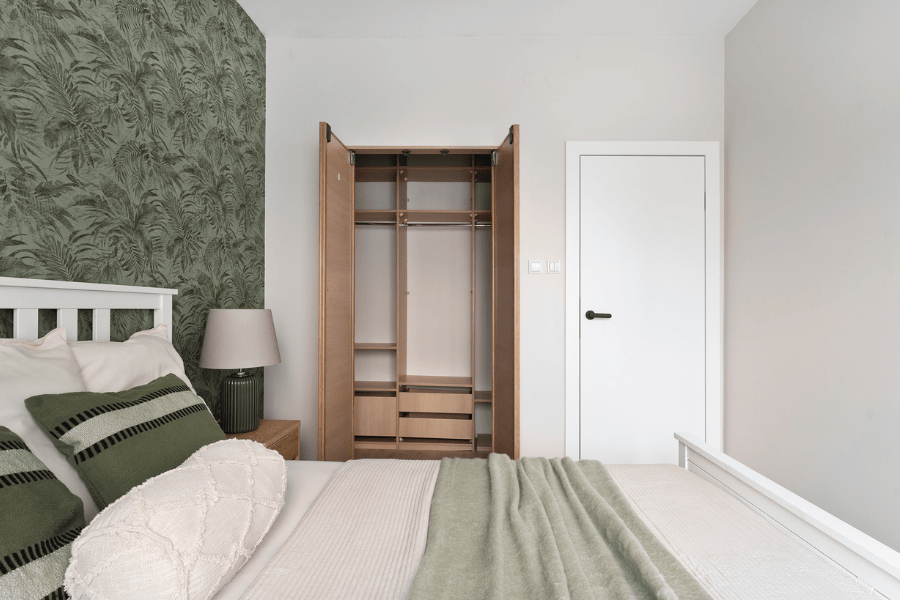 Jeśli jest jedno miejsce w mieszkaniu, które powinno wyciszać – to sypialnia. Zostawiliśmy solidne, stare łóżko, ale ubraliśmy je w nowe tekstylia. Na ścianie za zagłówkiem pojawiła się roślinna tapeta w odcieniach zieleni.